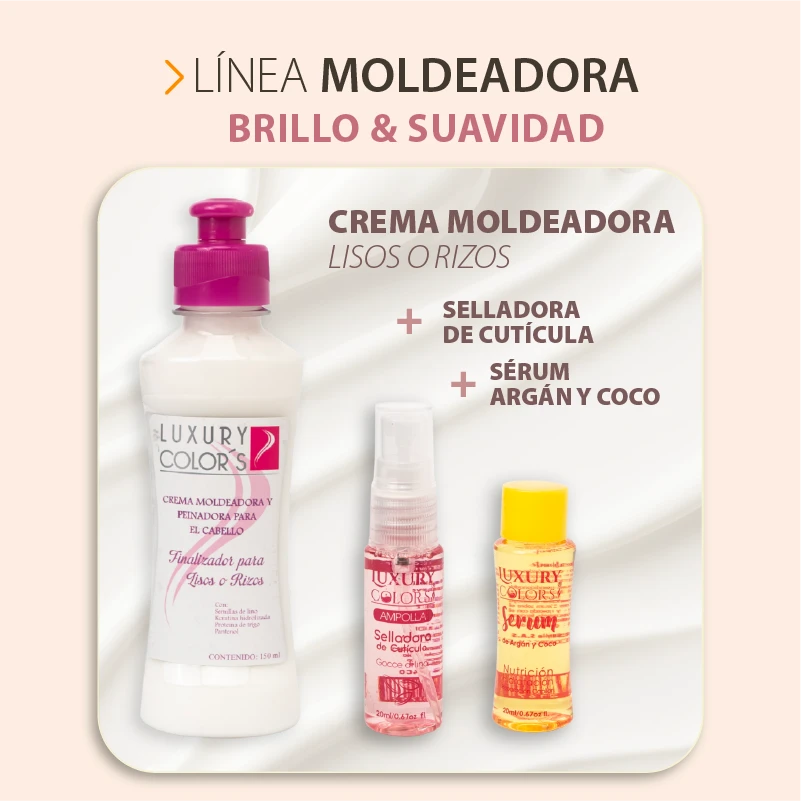 Crema Moldeadora y Peinadora (liso o rizo): Funciona como termoprotector, definidor y crema finalizadora. Formulada con semillas de lino, queratina hidrolizada, proteína de trigo y pantenol, repara puntas abiertas, aporta suavidad y protege del calor.