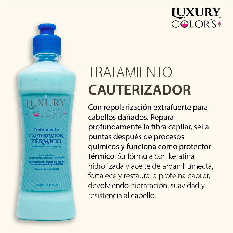Revitaliza tu cabello dañado con el Tratamiento Cauterizador Térmico Luxury Colors, una emulsión capilar de acción intensiva diseñada para reparar, hidratar y restaurar la fibra capilar desde la primera aplicación.